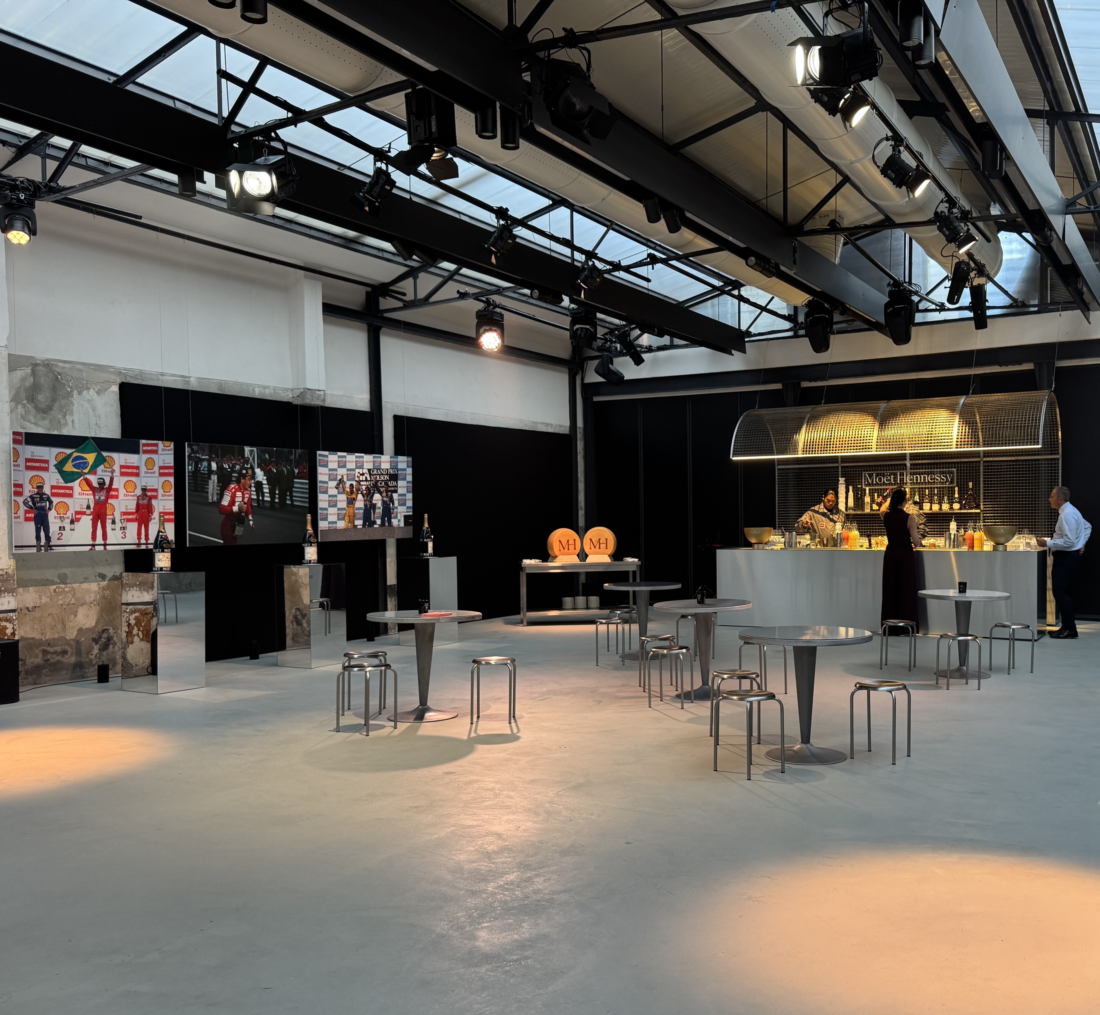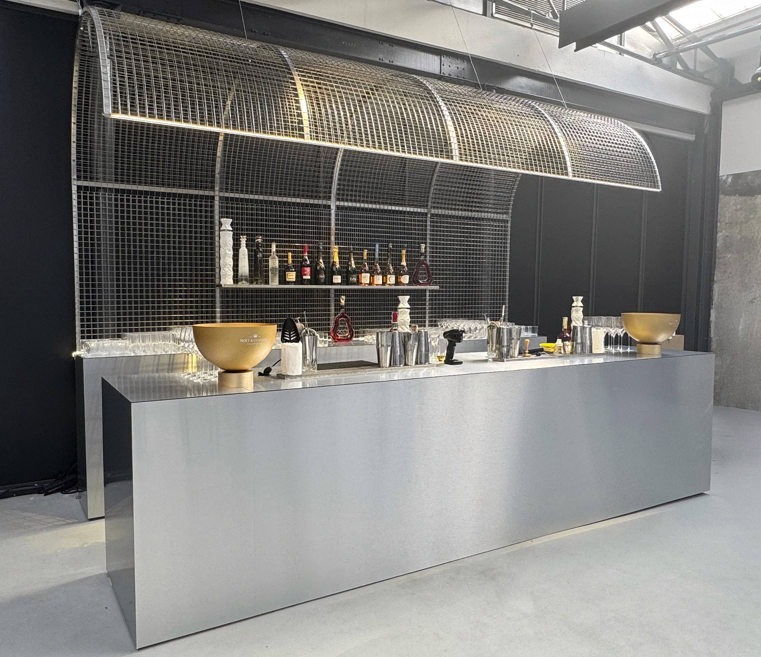 Une scénographie brute où le métal prend la pole position, un bar sur-mesure façonné par nos artisans et un aménagement pensé pour immerger les invités dans l’univers de la Formule 1. Une création réalisée pour un dîner d’influence, piloté par une maison de luxe française spécialisée en vins et spiritueux.