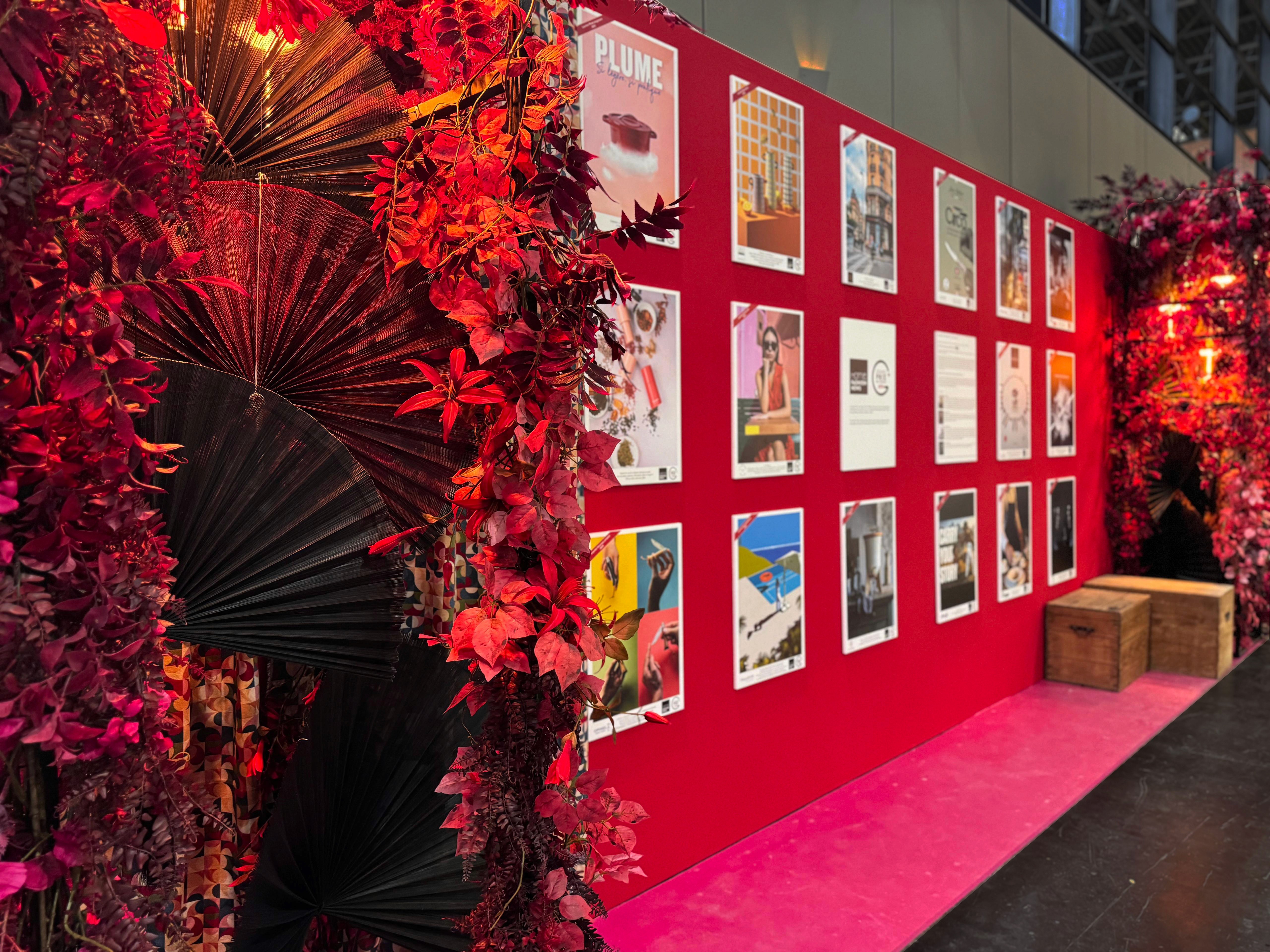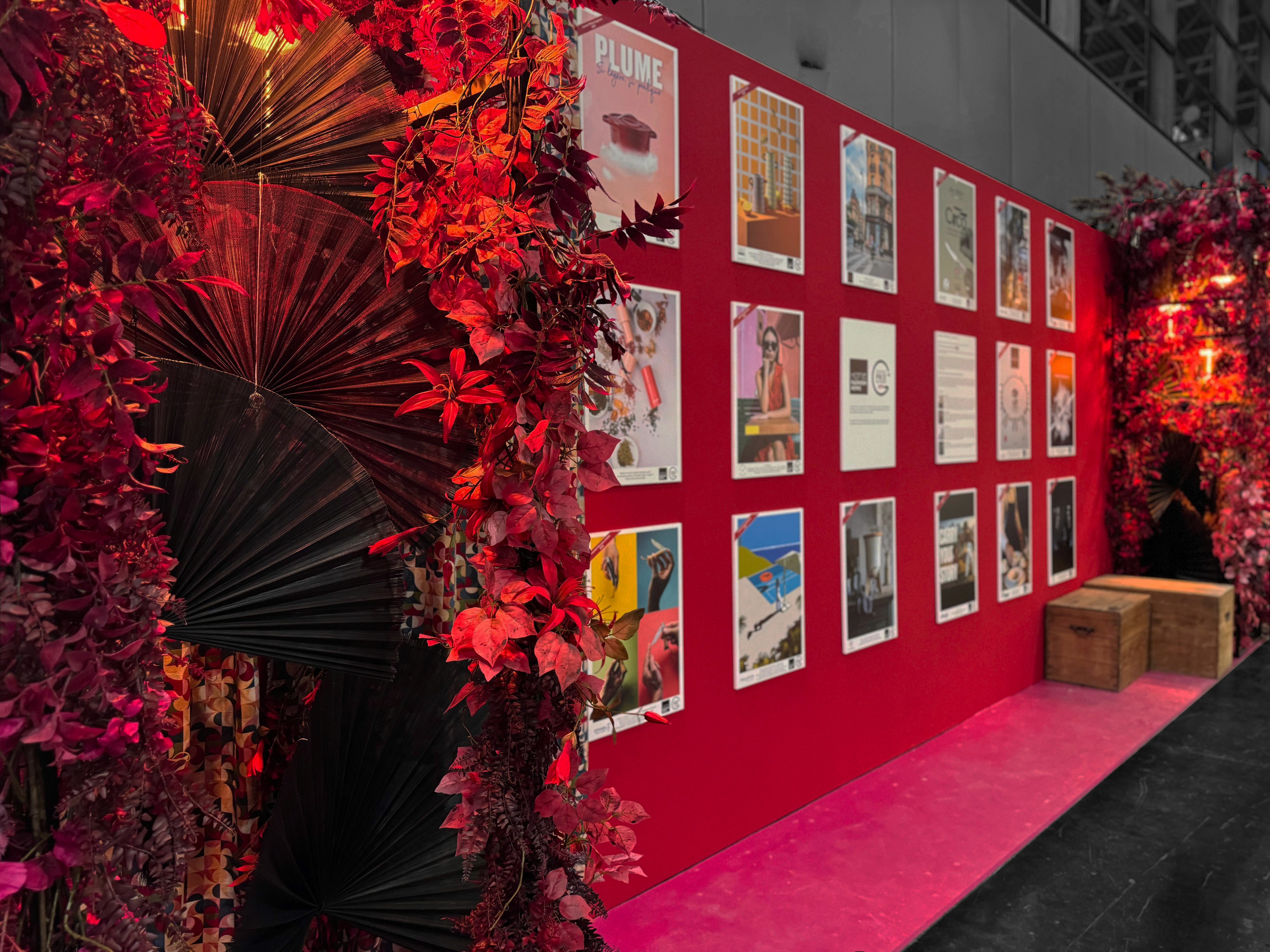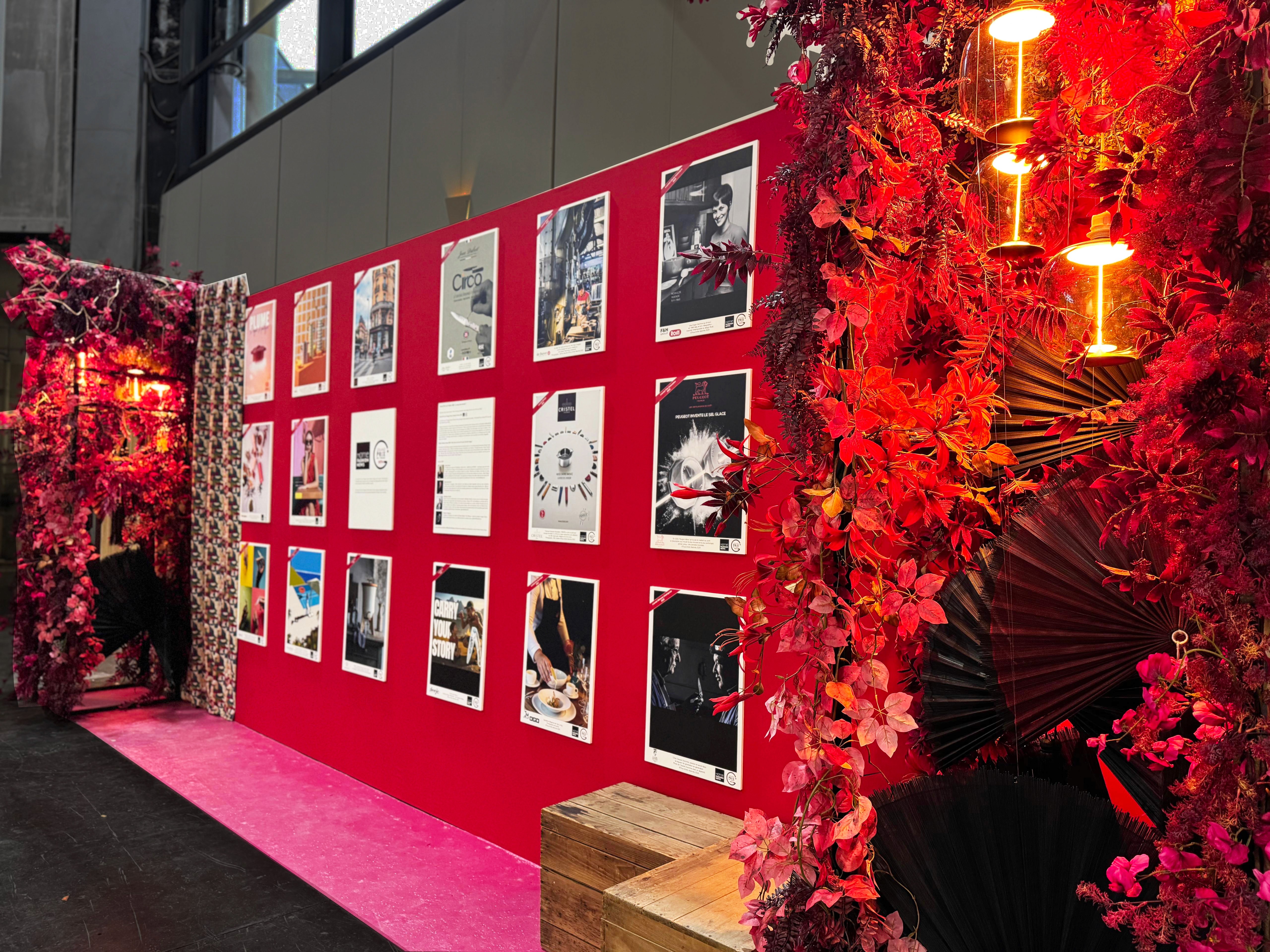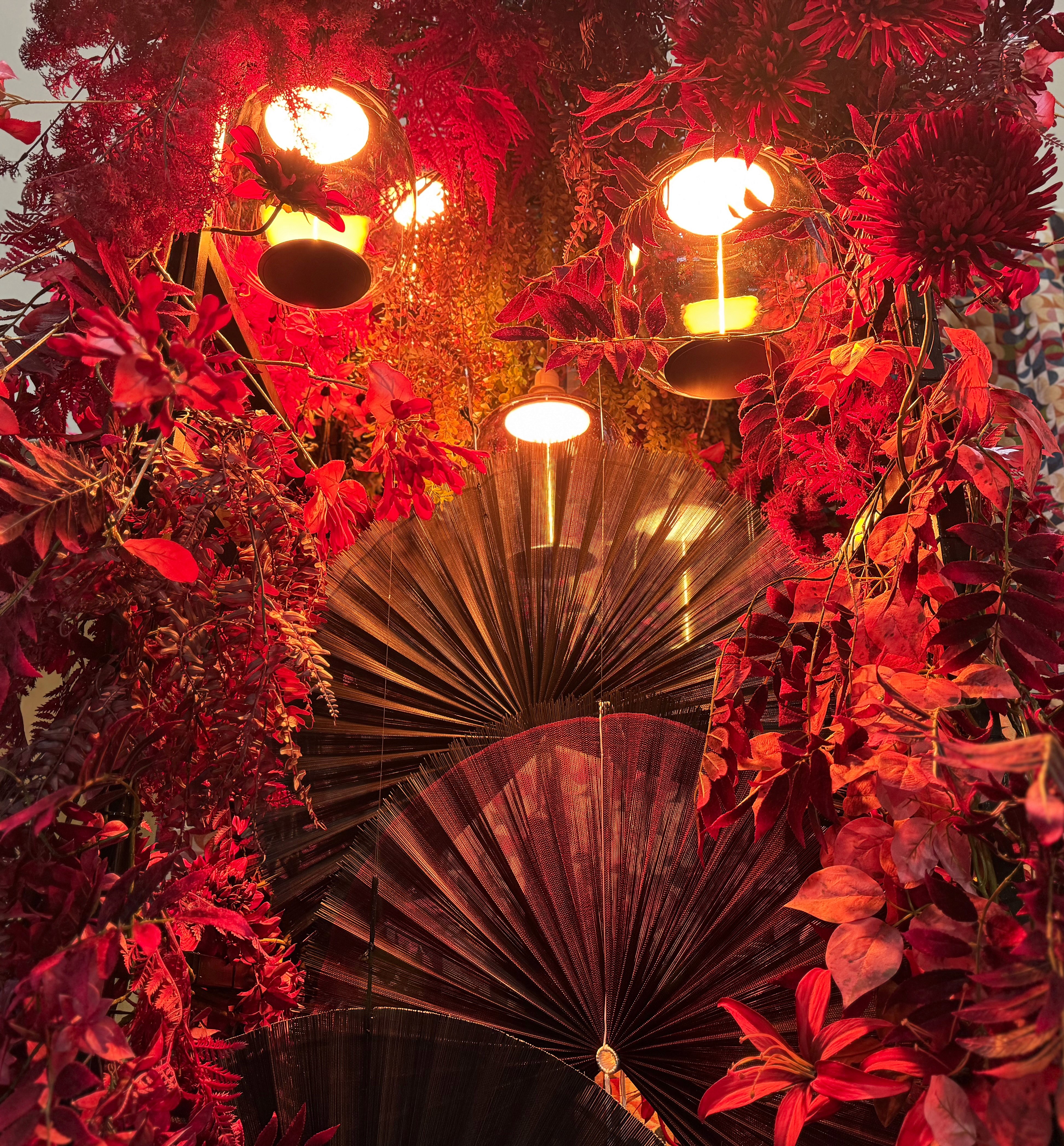 Une scénographie vibrante, où le rouge s’impose aux côtés d’éventails, de fleurs et de cadres, pour une mise en scène à la fois audacieuse et élégante.